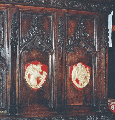 On the other four panels are carved and guilded the symbols of the Evangelists on red shields-