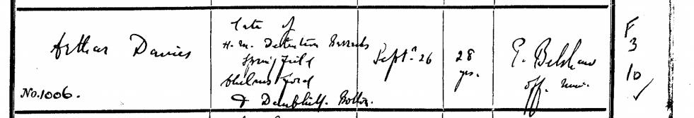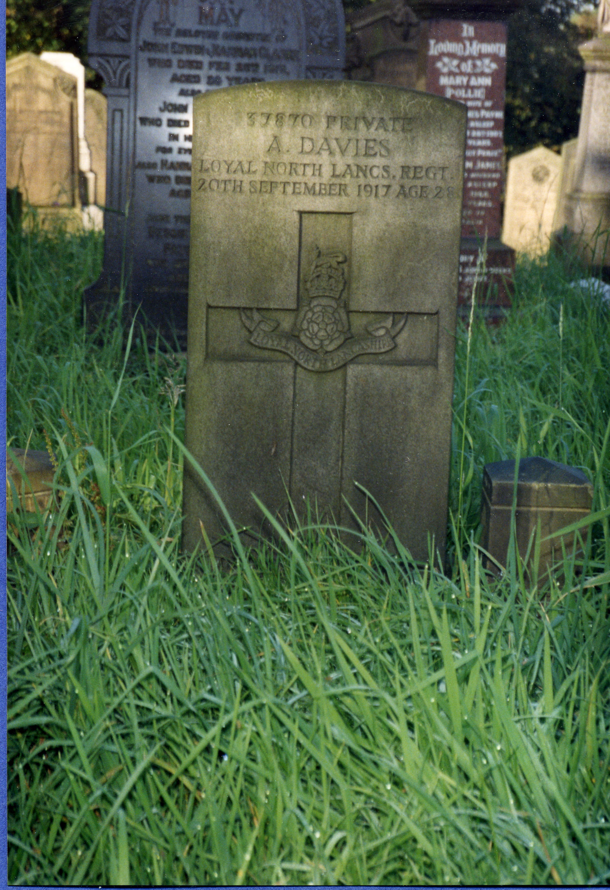 Notes: | Late of H.M. (?) Barracks, Springfield, Chelmsford Son of William and the late Margaret Davies; husband of Angelina Davies, of 37, St. Helens Rd., Bolton. Buried 26th September 1917 |