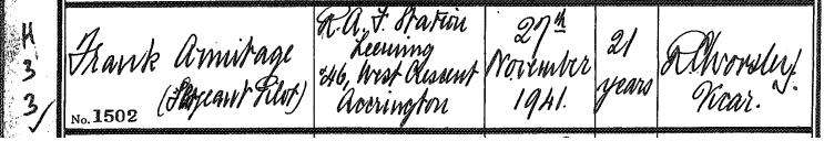 Notes: | RAF Station Leeming(?) 46 West Crescent, Accrington Buried 27 November 1941 Son of Daniel and Hannah Armitage of Bolton |