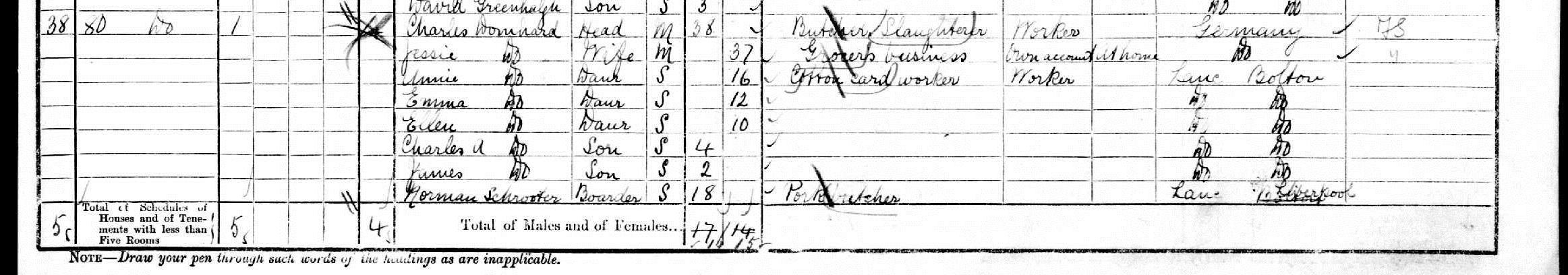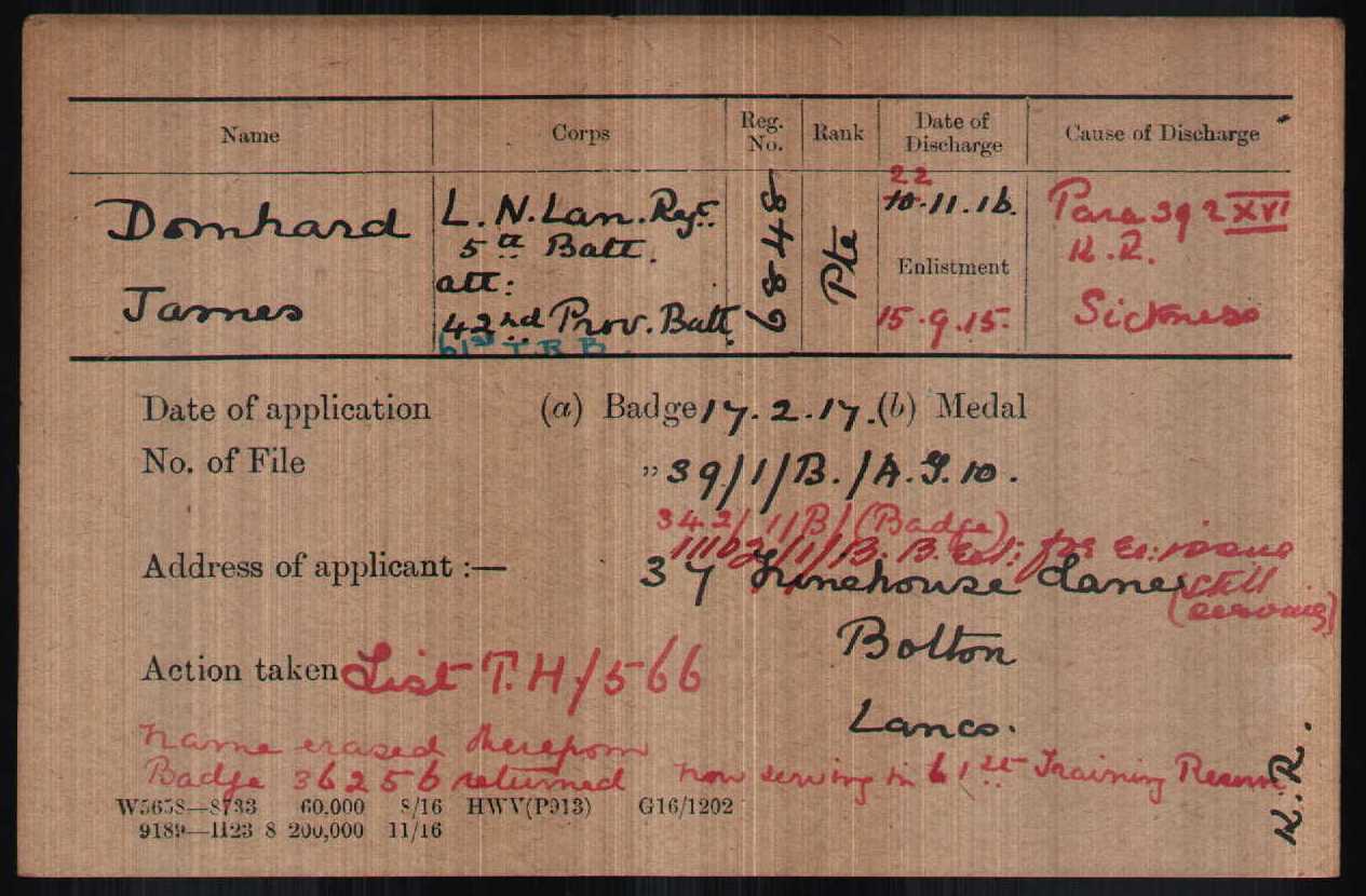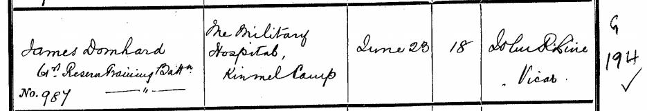 Notes: | The Military Hospital, Kinmel Camp Buried: 23rd June 1917 Parents: Karl and Jessie Domhard of 1 Apple Street, Bolton Census (1900) shows Karl and Jessie to be German and living at 80 Bull Lane, Bolton (Bradford Ward)with children Annie(16), Emma (12), Ellen (10), Charles A. (4), James (2) and a Boarder, Norman Schrooter (18). It appears Pte Domhard changed Units as can be seen from a record card. |